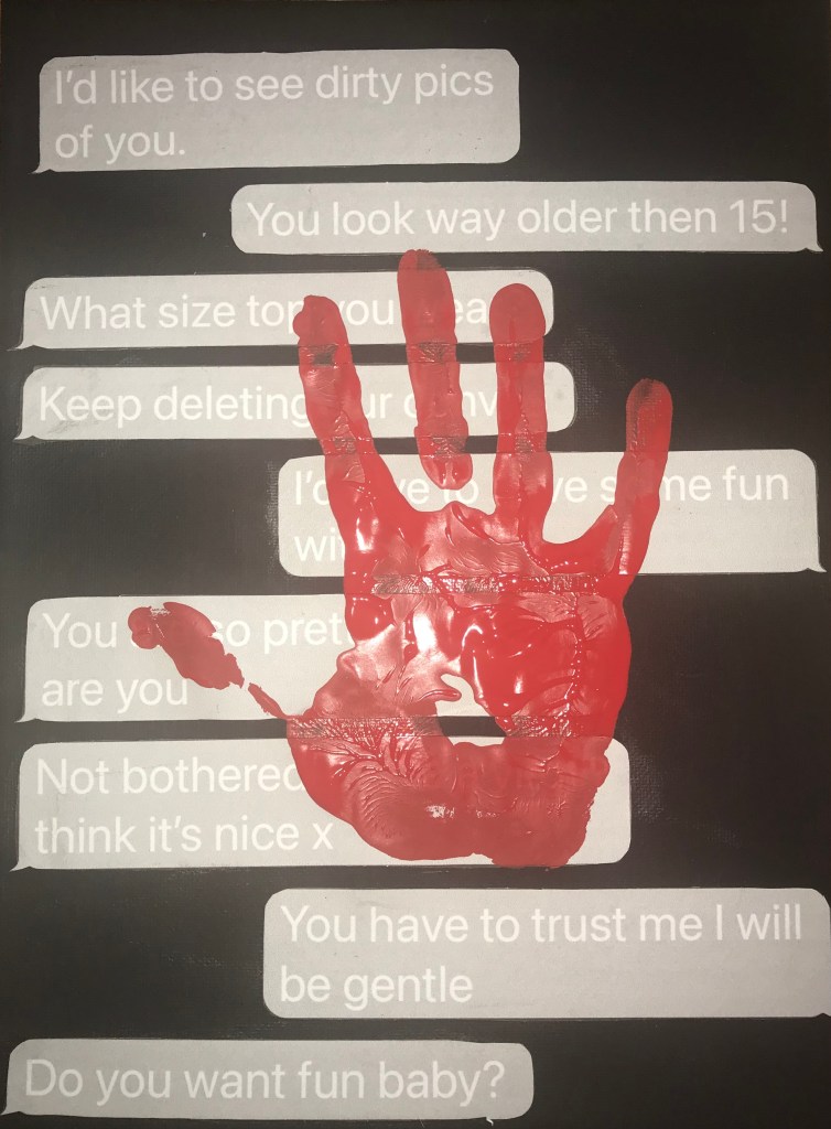 Clarelle’s Painting – MMIWG & Sex Trafficking – I used a black canvas, red paint and printed out text messages that I retyped from real online predators. The text messages are the online method of sex trafficking and the red handprint represents Missing and Murdered Indigenous Women and Girls.