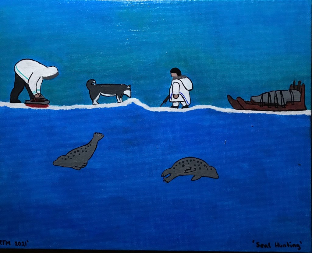 Ryleigh’s Painting – No child or family should worry about how they’ll afford food, but this is exactly what many families face on a daily basis across Nunavut. Nearly 70% of homes face food insecurity and are left with little to no nutritional affordable foods in grocery stores. I was inspired after watching Angry Inuk to do my final project on food insecurity and their traditional practice of hunting.