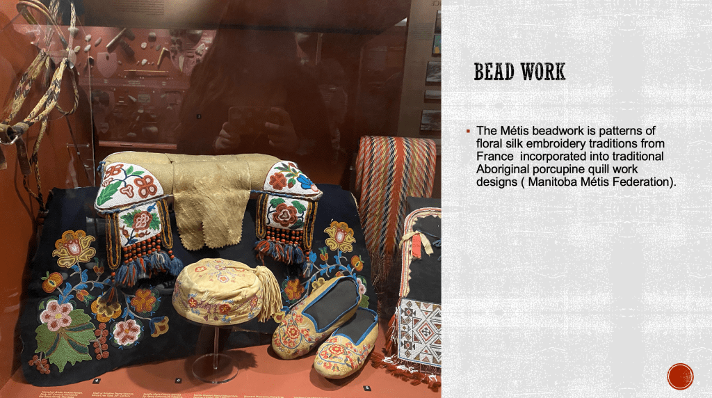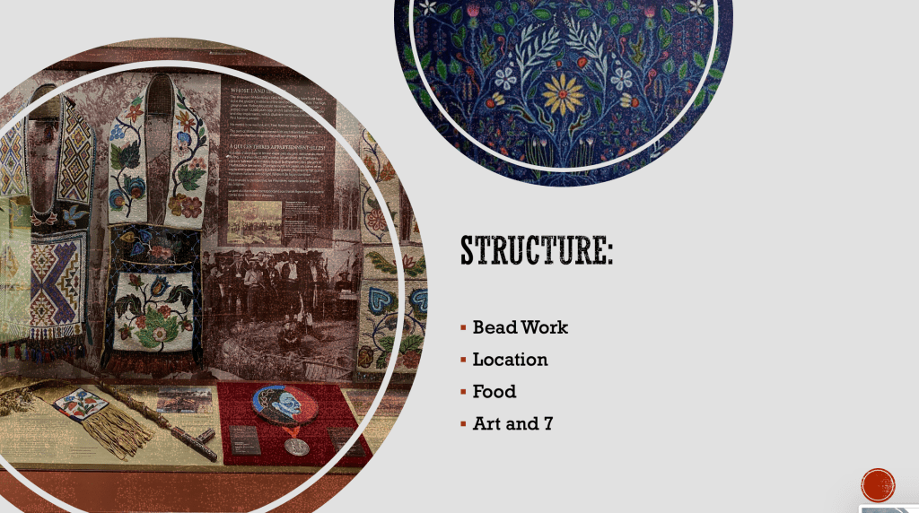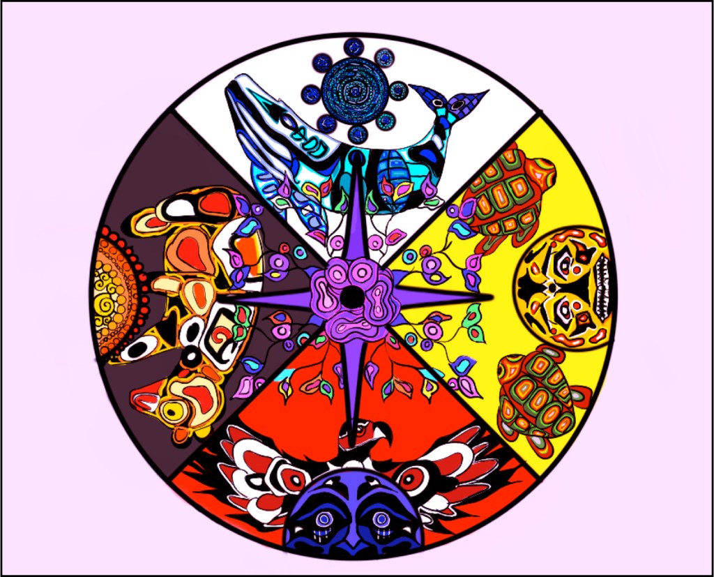 The method that I used to create my medicine wheel began with researching aboriginal artwork and taking inspiration from each of the different art styles. I looked up the different elements that I wanted to include and researched how they were drawn traditionally and then did a rough sketch of want I wanted to draw. After deciding on the elements, I sketched them again to figure out the spacing on the medicine wheel. I chose animals for each section of the medicine wheel that they best represented. I also used symbols of the sun, moon and stars to represent different times of the day using traditional indigenous art form. The medicine wheel is also known as a sun dance circle so the sun is significant. I added flower embroidery in the middle of the wheel to tie the four sections together to show that there is a flow from one section to the next. The middle flower represents points of a compass because the medicine wheel has directions. I also researched the colour scheme to use the traditional colours. When choosing the objects and animals I related it back to their quadrant.It is important for Canadians to understand the spiritual and cultural traditions of Indigenous People so we can continue our path of healing and peace. – AVA