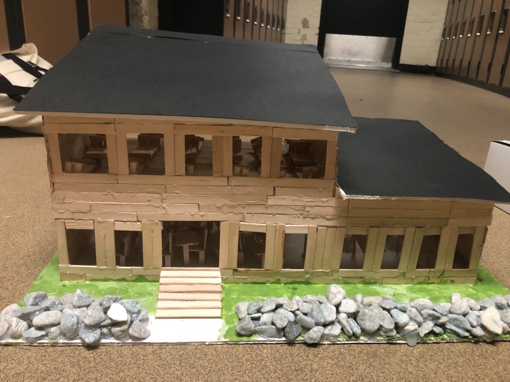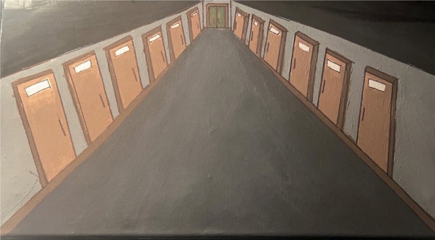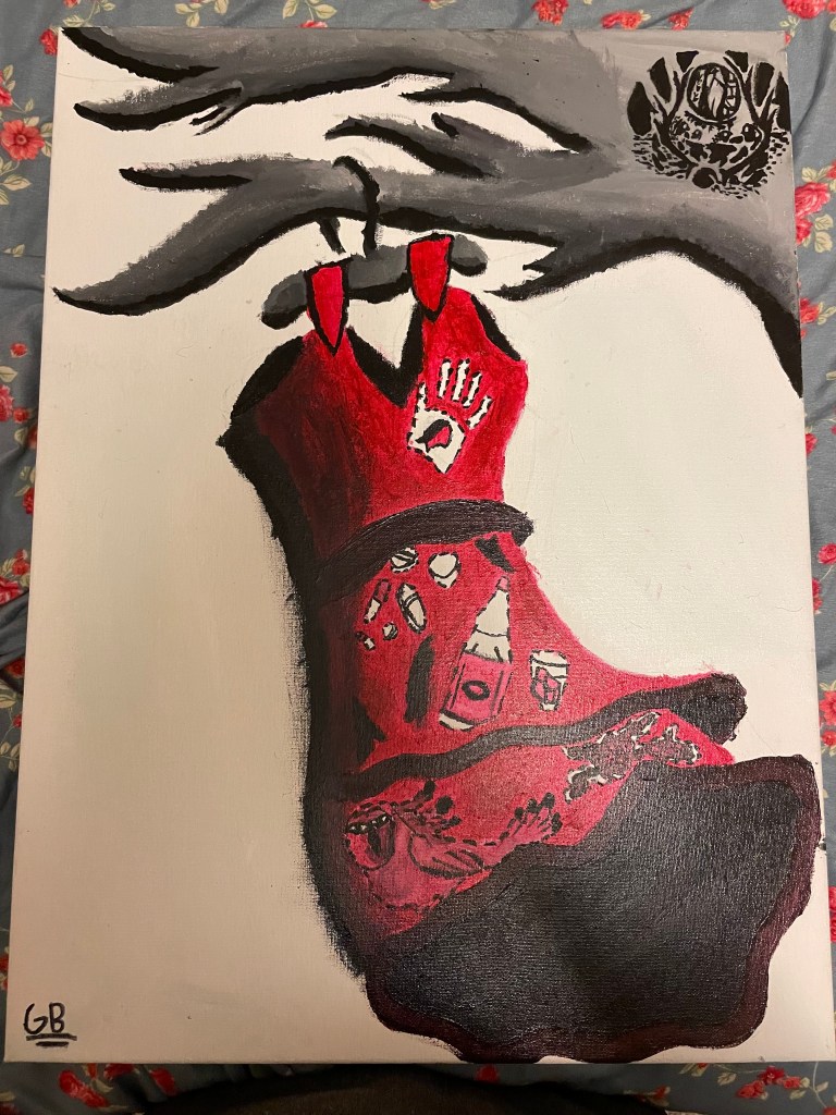 My painting is called “Connections in Canvas”. I wanted my painting to be very symbolic, so I thought about what all the elements could represent. On the Indigenous side, everything is being casted as a shadow – a silhouette. This represents how Indigenous culture and history is being shadowed and not learned/understood about as much as it should be. I wanted to highlight key parts of the Indigenous culture, so I added a bison and crops, symbolizing how Indigenous communities embrace nature through intergenerational wisdom and diverse cultural perspectives. On the right side of the painting symbolizes westernized society, including tall buildings and not much natural land embracing. The tall buildings represent colonization as it represents dominance of the settlers.