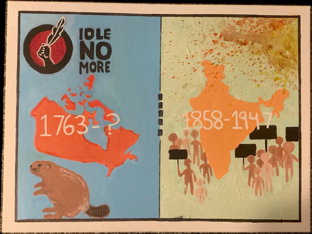 Most of the things were similar between these two places but the one thing that was and still is different is that India has gained independence whereas Indigenous people are still under colonization. I have shown this in my painting by putting the starting date of when British Colonialism began on Turtle Island and then putting a dash which led to a question mark, portraying that we don’t know when this colonialism is going to come to an end.