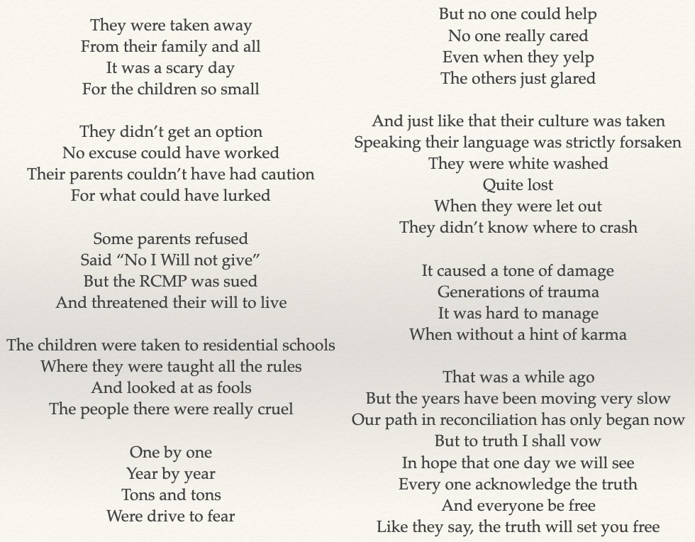 I chose to write an original poem for my individual inquiry project. The poem Is called “The Truth Will Set You Free” and it is about residential school, so basically a small summary of how Indigenous children were taken away from their home, taken to residential schools, how they were treated there, the trauma it caused, and where we are in reconciliation today. The name for my poem just came to me automatically after I finished writing the poem. My first research question was “How easily can indigenous language be translated to English?” and “How can a person with English as their only or main language translate an indigenous language without having no prior experience?” My idea was to write a poem, translate it to an indigenous language such as Ojibwe, then write that poem on a poster with an original background art that I would paint. Unfortunately, I could not find any online or easily accessible translators for indigenous languages, and also couldn’t find much information on it, so I couldn’t include that in my inquiry project. There was one online translating website that can translate many Indigenous languages, but it costs a lot. For one quote in an Indigenous language of Canada to be translated to English or vice-versa, the minimum charge is $500, so I was obviously not going to pay that much to translate the poem. So, i changed my research question to “ How did residential schools impact indigenous people” I chose to write a poem because it is something I have enjoyed doing since I was young, and also because I know that many Indigenous people write poems to express their hardships and generational trauma caused by residential schools and the sixties scoop. I didn’t necessarily want it to be on residential schools, but instead, wanted to write it on Tina Fontaine, however, I found it hard to gather a ton of information on her. To write the poem, I used everything I already know on residential schools to write a draft if it, then fact check it by looking for trustworthy and credible cites that say the same thing. If what I wrote is not true, I replace it with something else that IS true. Once the poem is finished, I got to painting the background of my poster (canvas). I used Indigenous art as inspiration, and used colours that represent something in Indigenous cultures. For example, I used yellow & orange which symbolizes the sun and wisdom, red, which usually represents war & courage, and black, which represents death. The background art is sort of like mandala art, which I have done before. I wanted to write the whole poem on the poster but there wasn’t enough space for me to do that, so instead, I wrote just the title in calligraphy. I chose calligraphy because it is one of the things I really enjoy and am good at. Although I usually don’t do calligraphy in paint with paintbrushes, I think I did a good job on it.